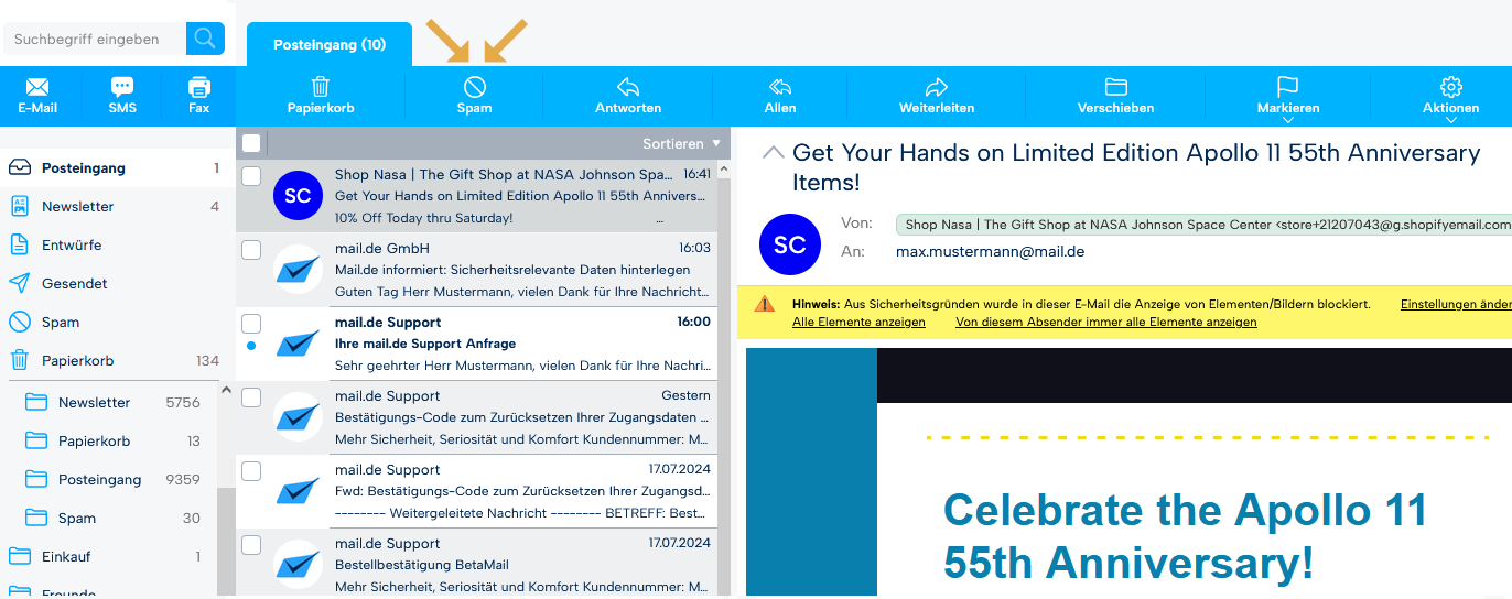 Haben Sie den Eindruck, dass Sie eine unerwünschte Werbe-Nachricht (SPAM) erhalten haben, so können Sie diese auswählen