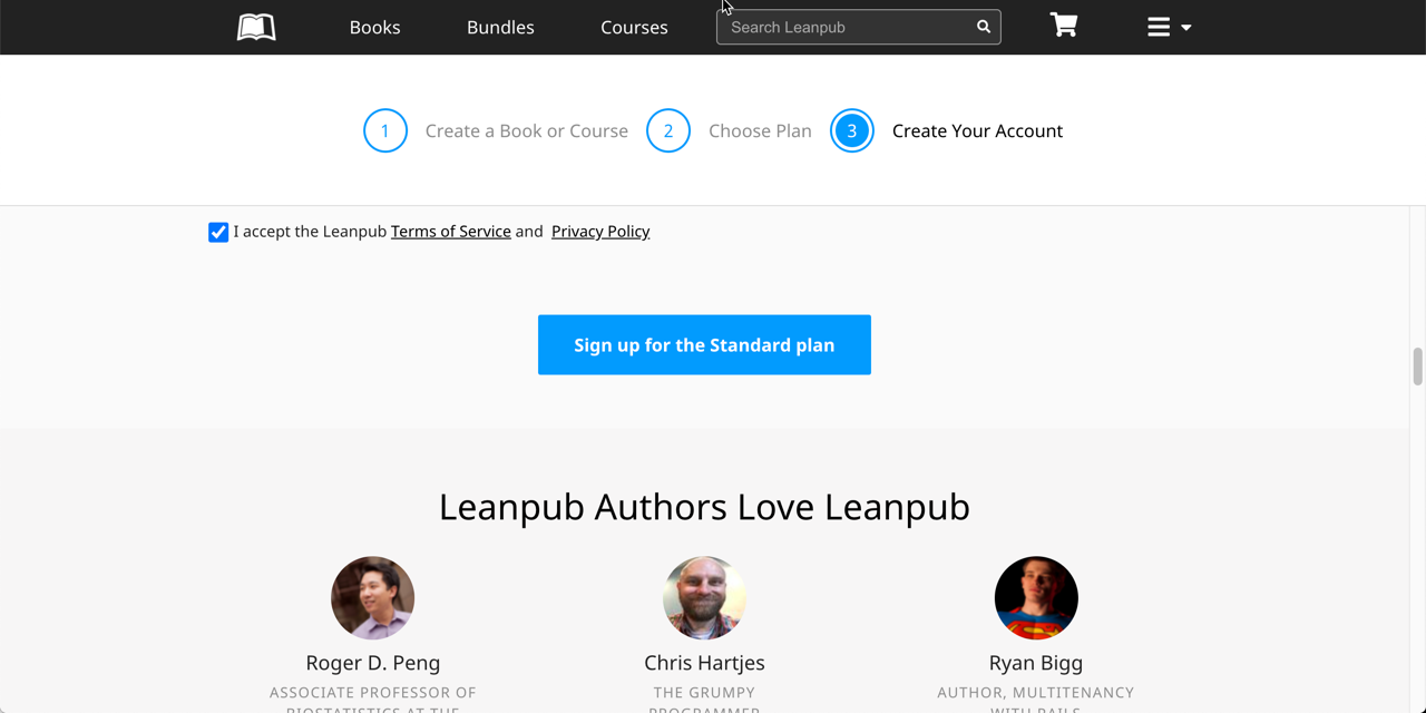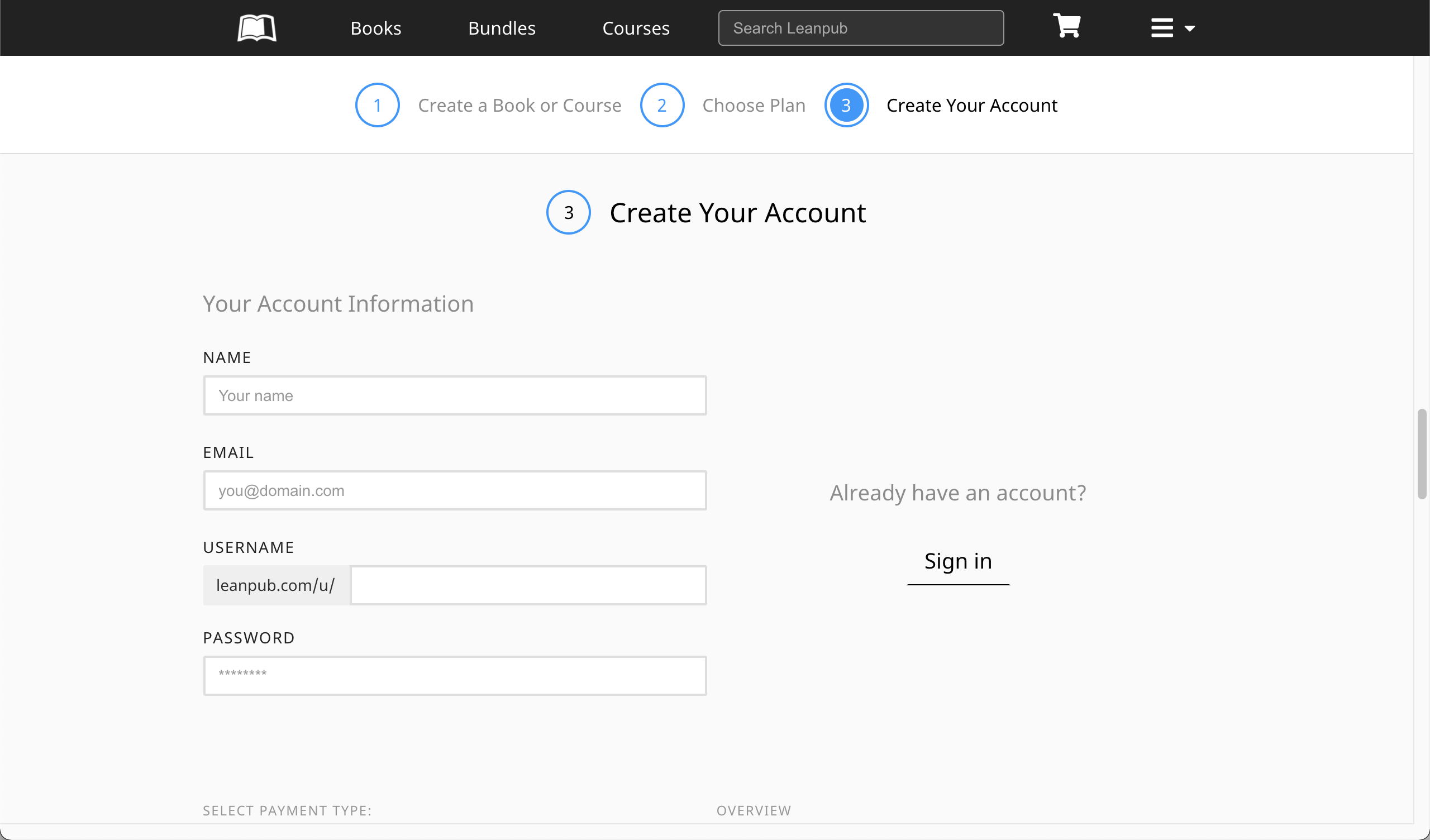 Scroll down and, if you are not signed in to a Leanpub account, you will see an option to enter information to create a new account. You will also see an option to sign in, if you already have a Leanpub account.
