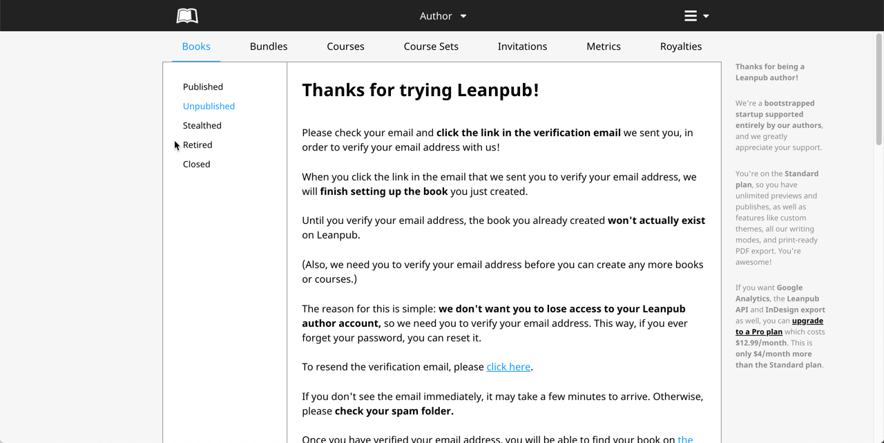 If this is the first Leanpub book you have created, you will see a page that is asking you to verify your email address: