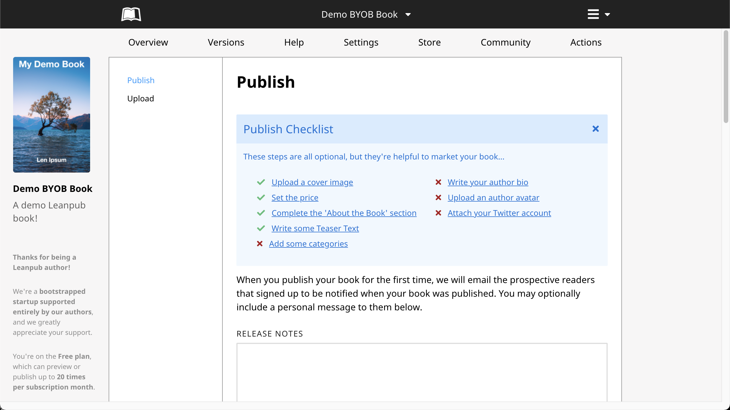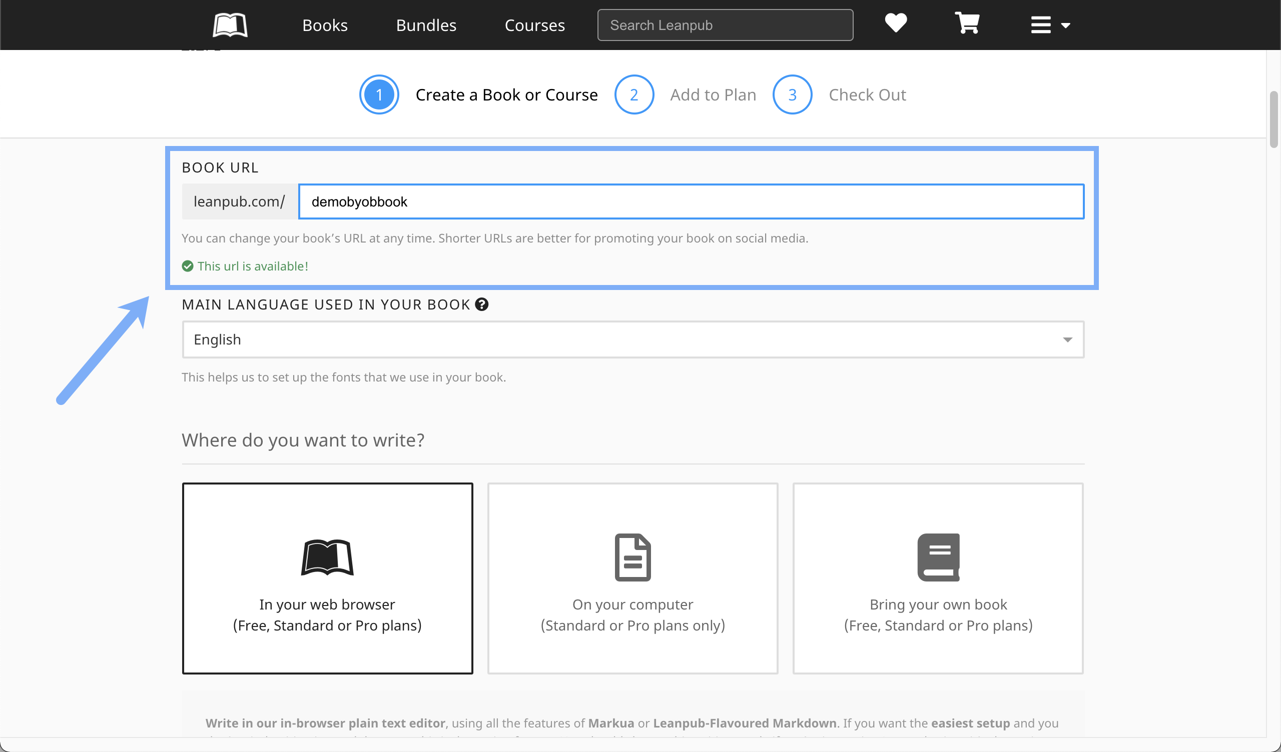 To begin, go to https://leanpub.com/create/book to create a book in our Upload writing mode: