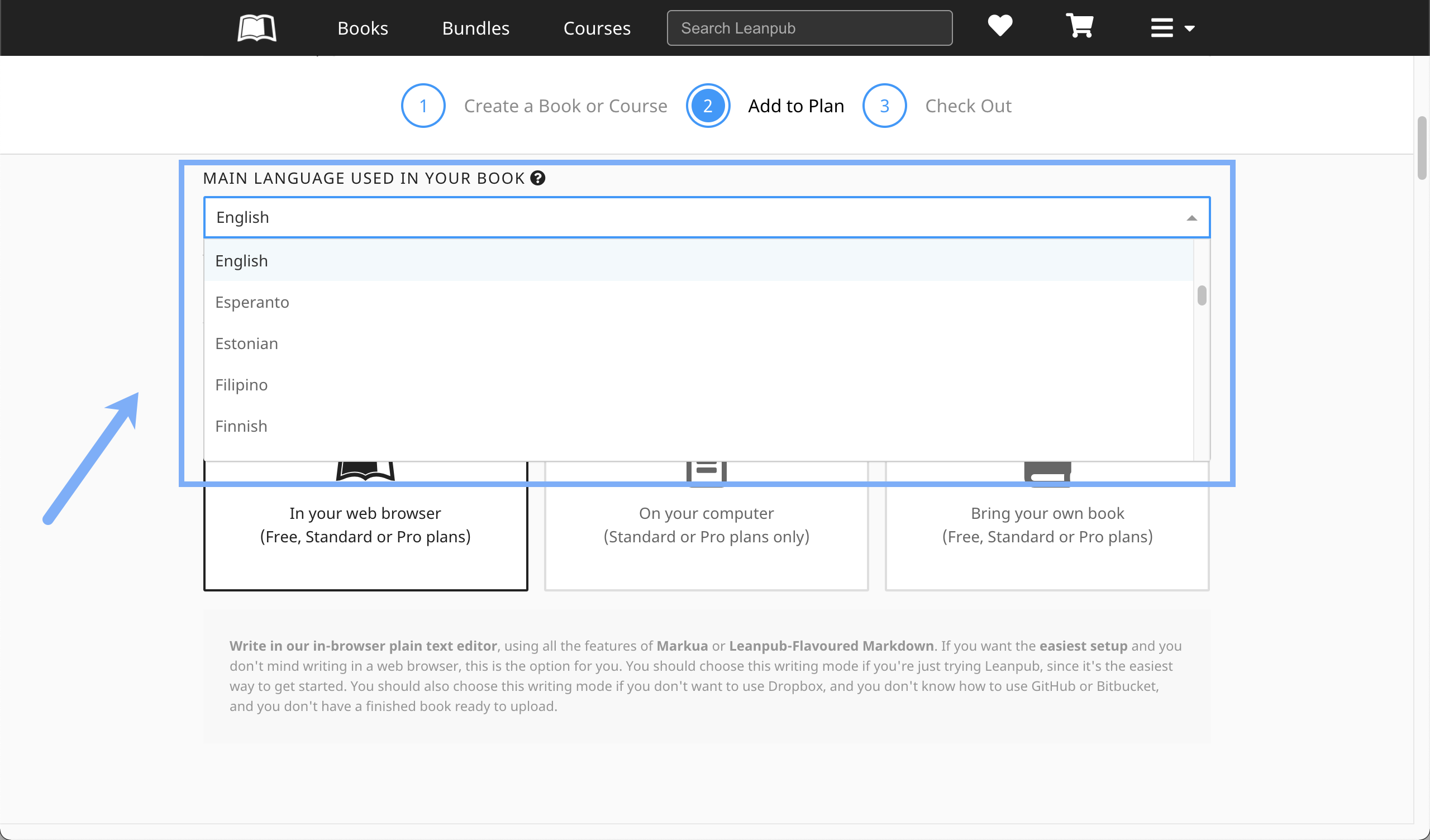 Scroll down and you will see "MAIN LANGUAGE USED IN YOUR BOOK." You can select a language from the drop-down. Like the other settings, you can change this at any time: