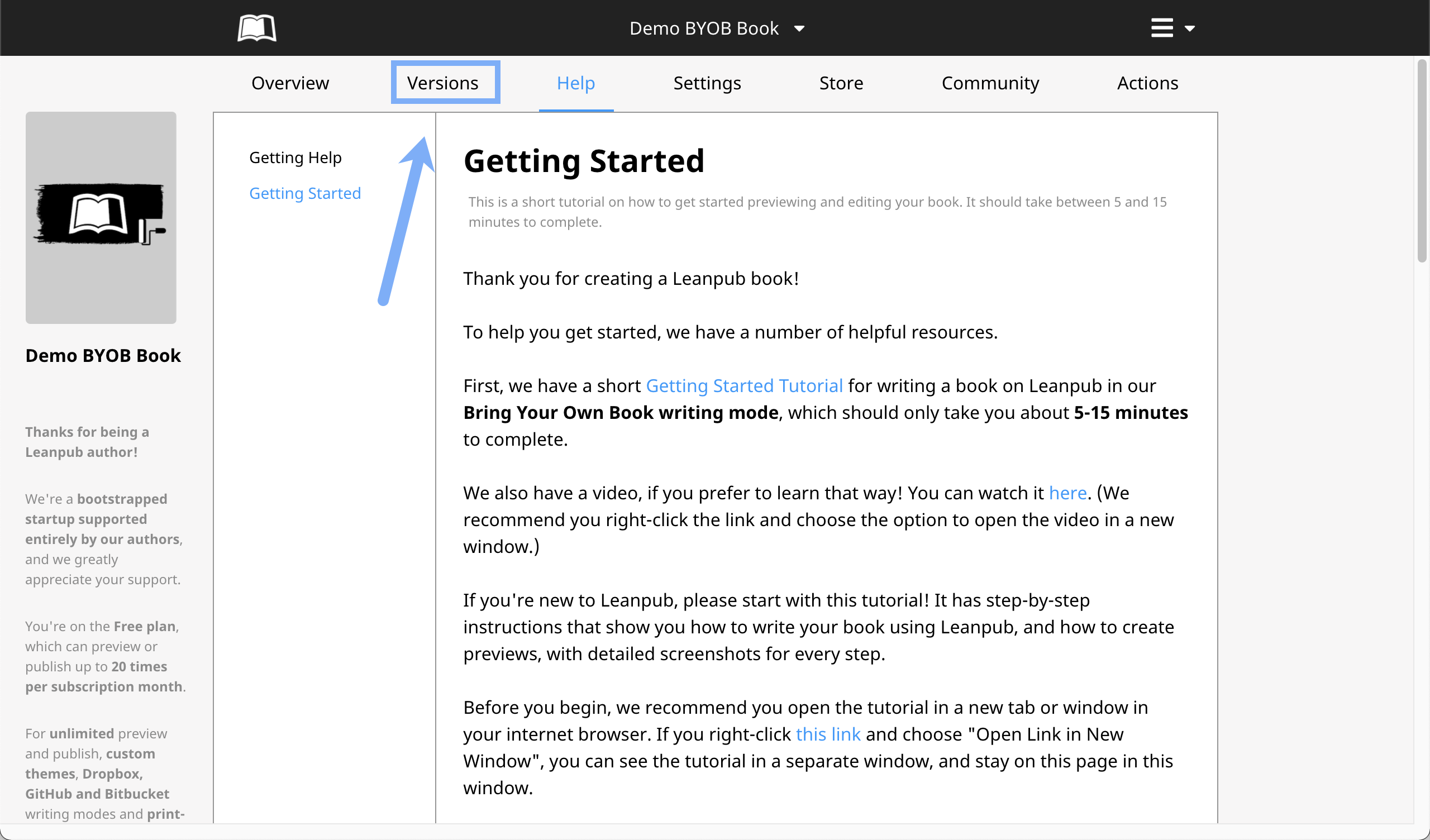 To publish your book, go back to the Versions section, by clicking the "Versions" tab in the menu at the top of the page: