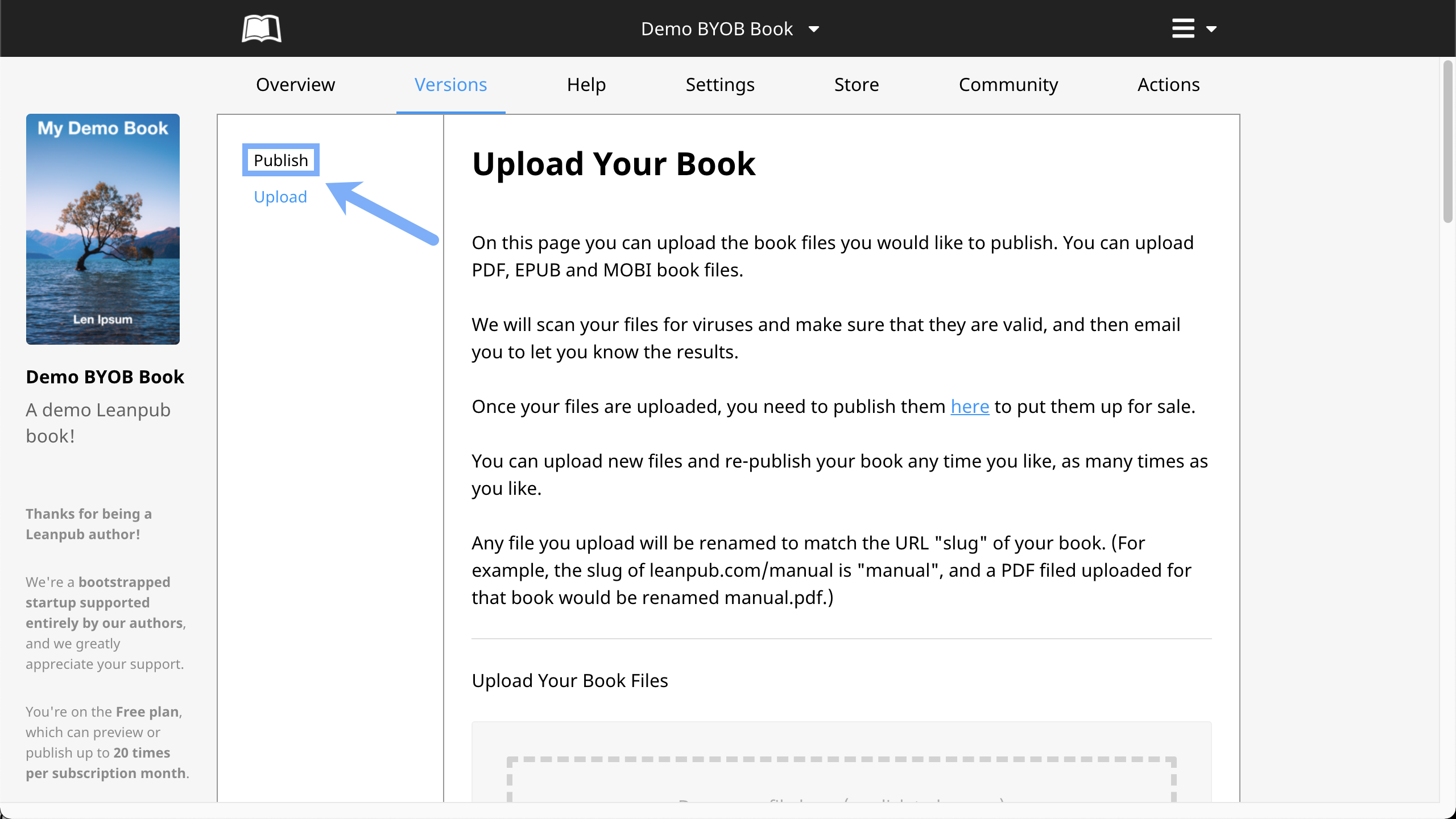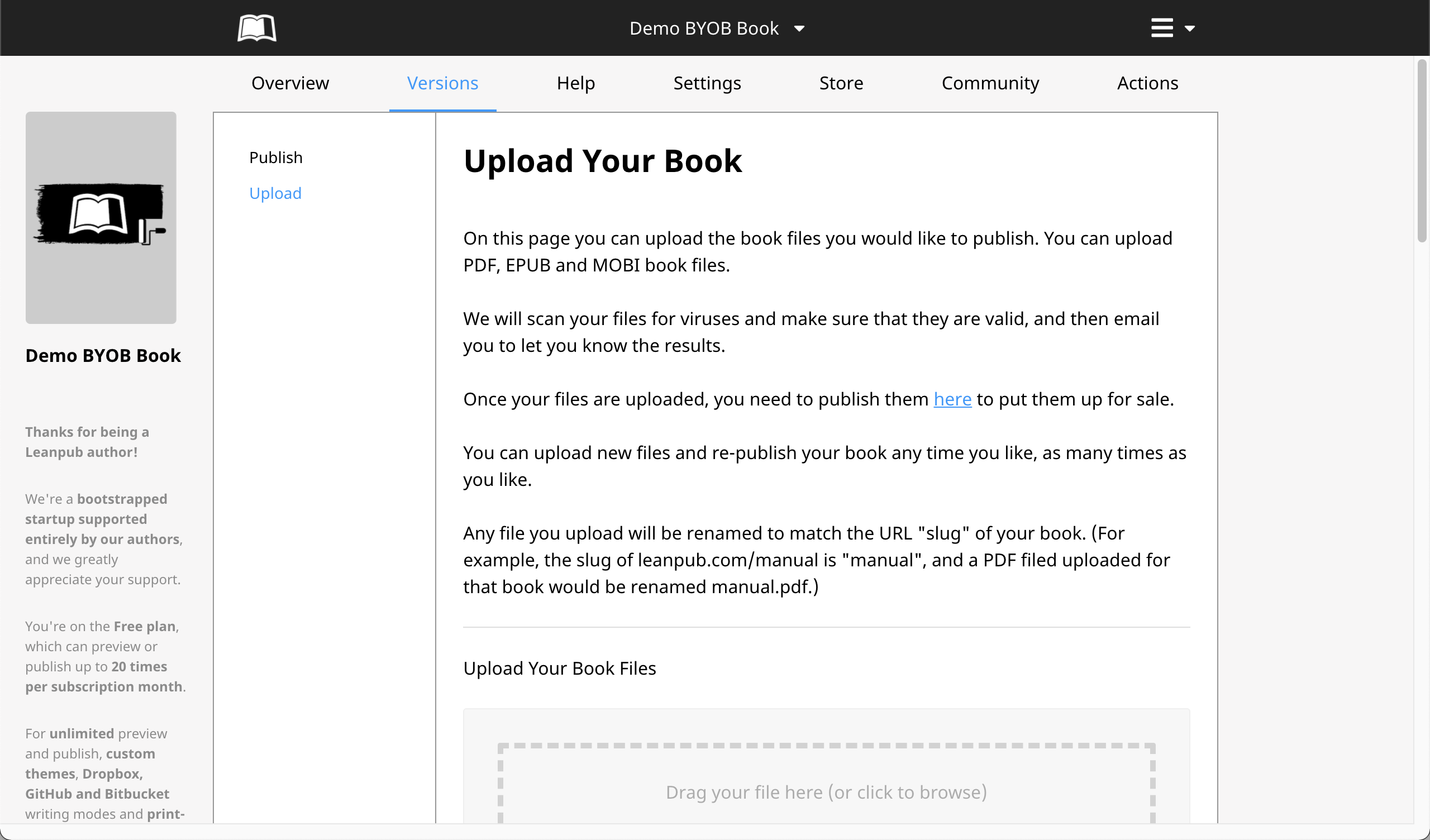 Leanpub books are easy to update. To update a book in the Upload writing mode, all you need to do is go to Versions > Upload and upload a new ebook file at any time, like we did at the beginning of this tutorial. If your book is already published you don't have to do anything else: the new file you upload will simply replace the old one.