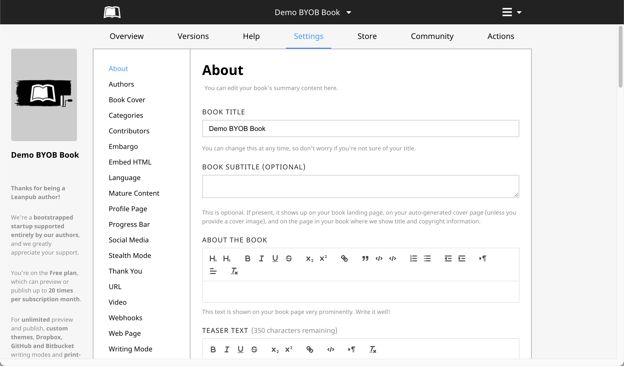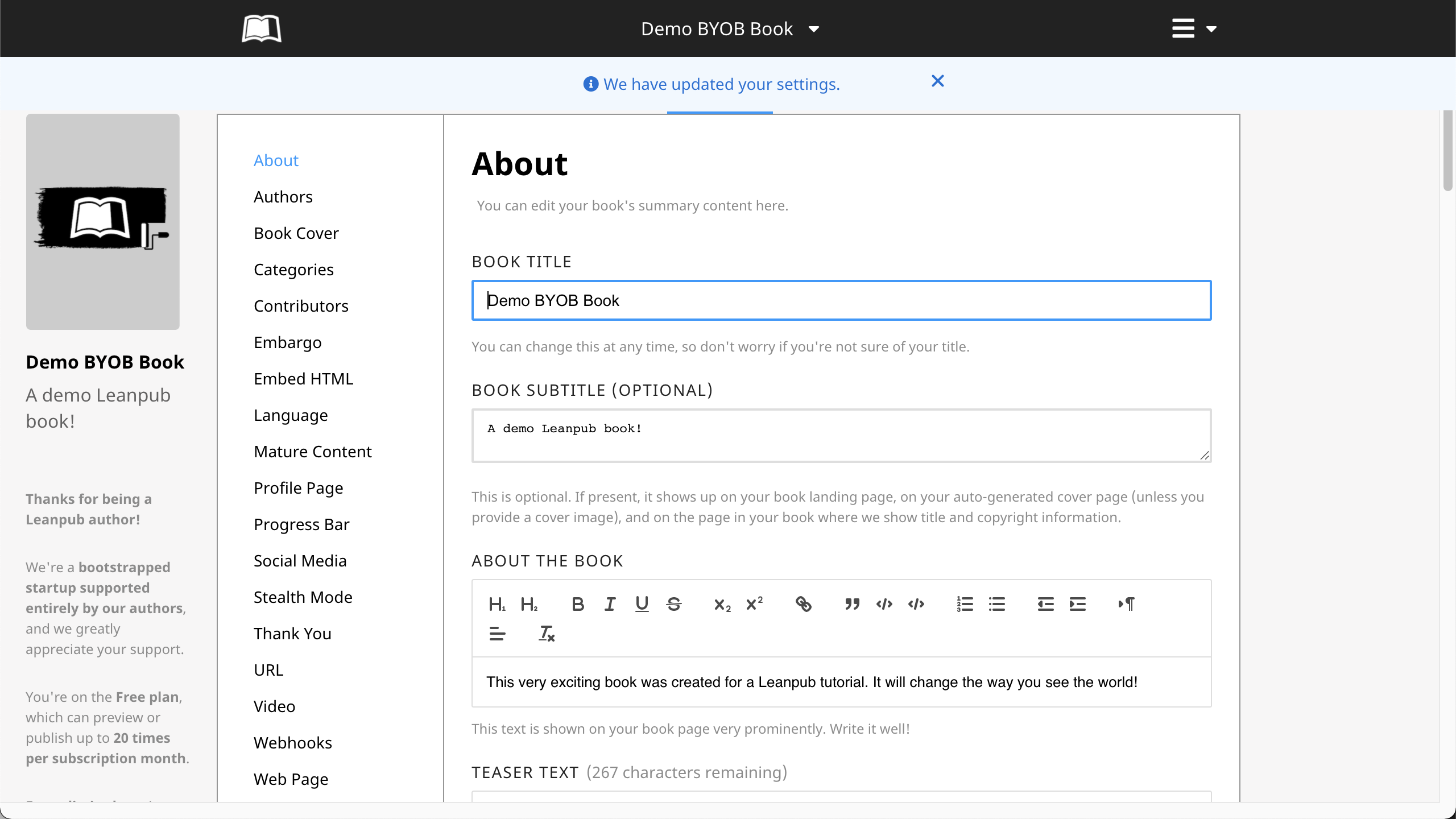 On this page, you can add your book's subtitle, a description of your book that will be displayed in an "About the Book" section on your book's Leanpub web page, some "Teaser" text, and a "Meta Description" for search engines.