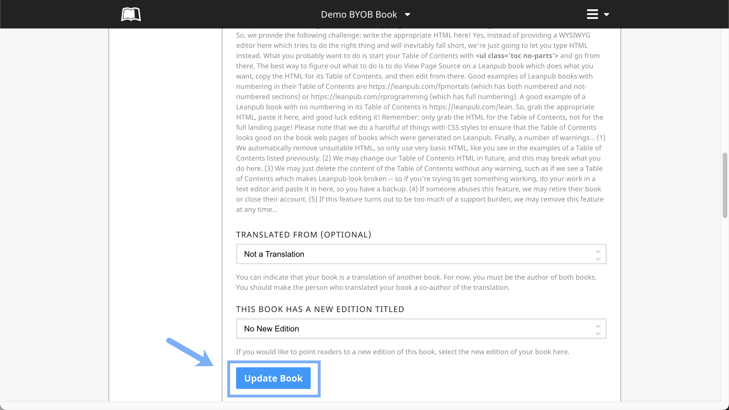Finally, review your information and scroll to the bottom of the page and click the "Update Book" button: