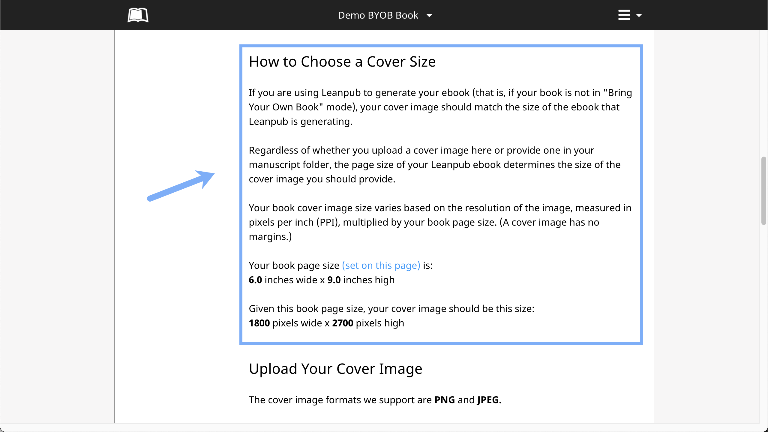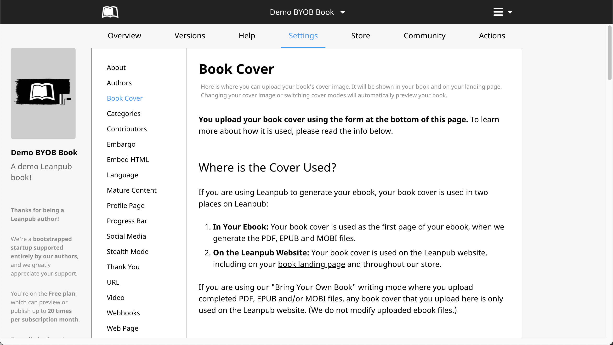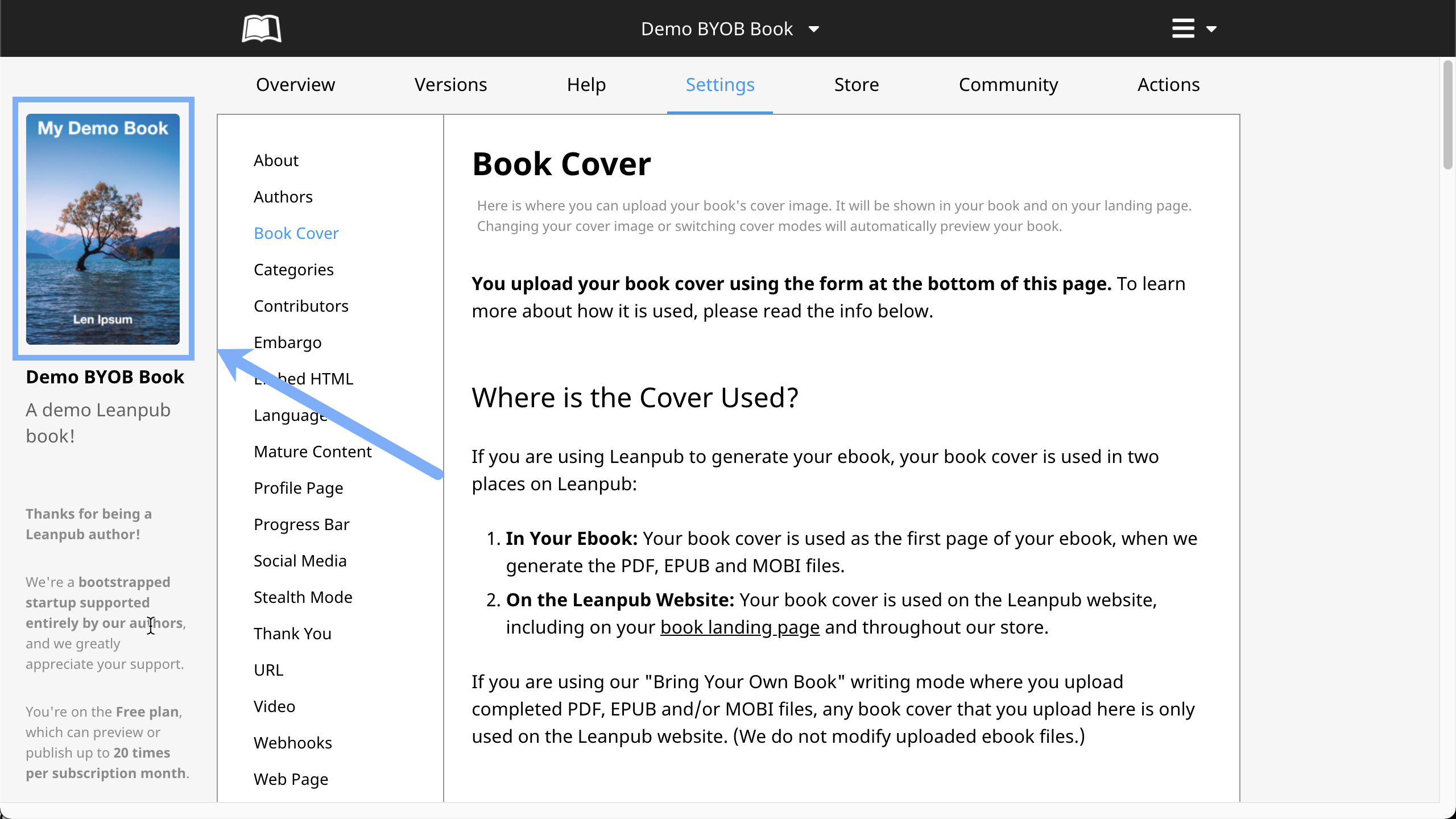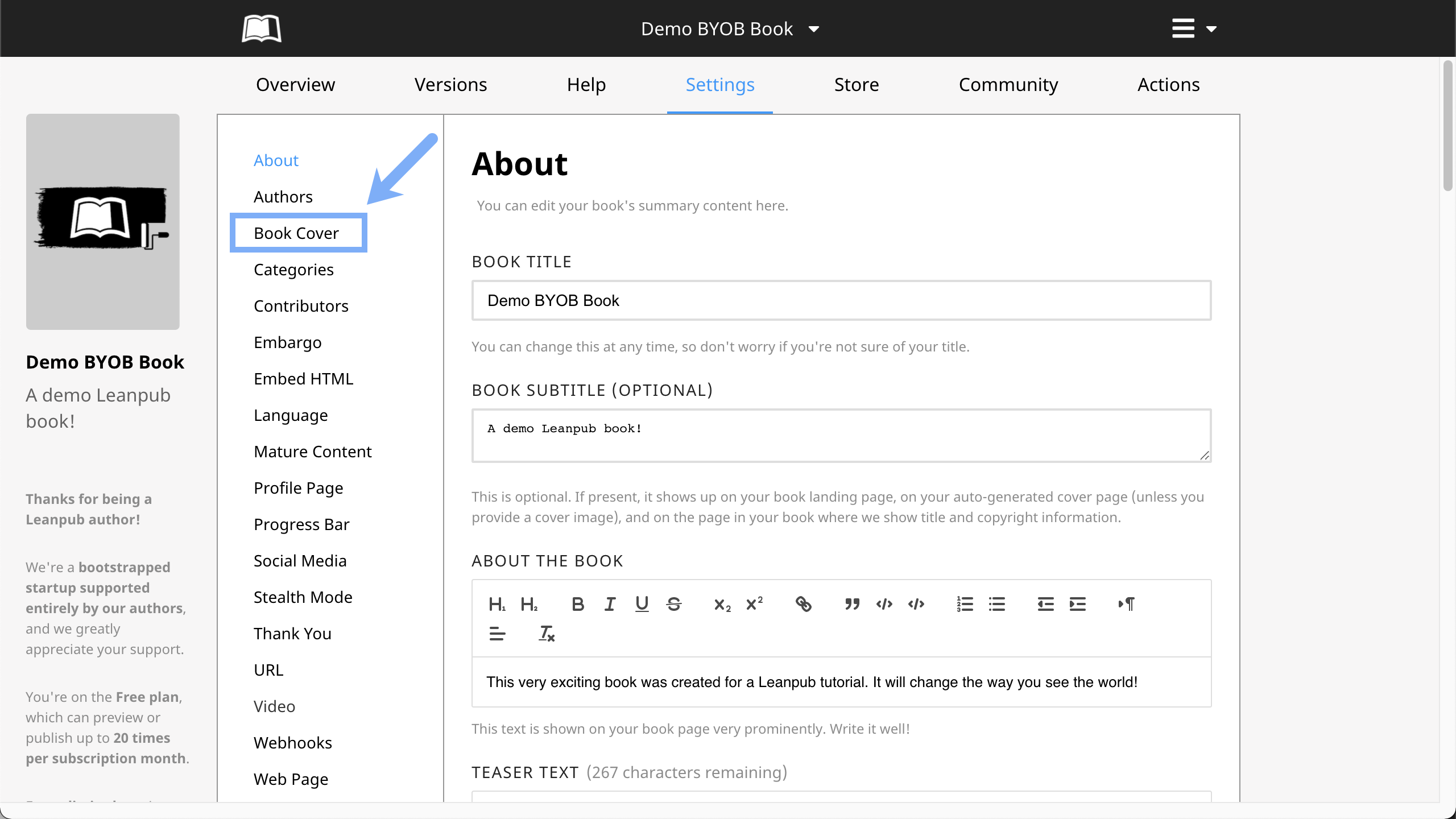 To upload your book cover image to Leanpub, click on "Book Cover" in the vertical menu to the left: