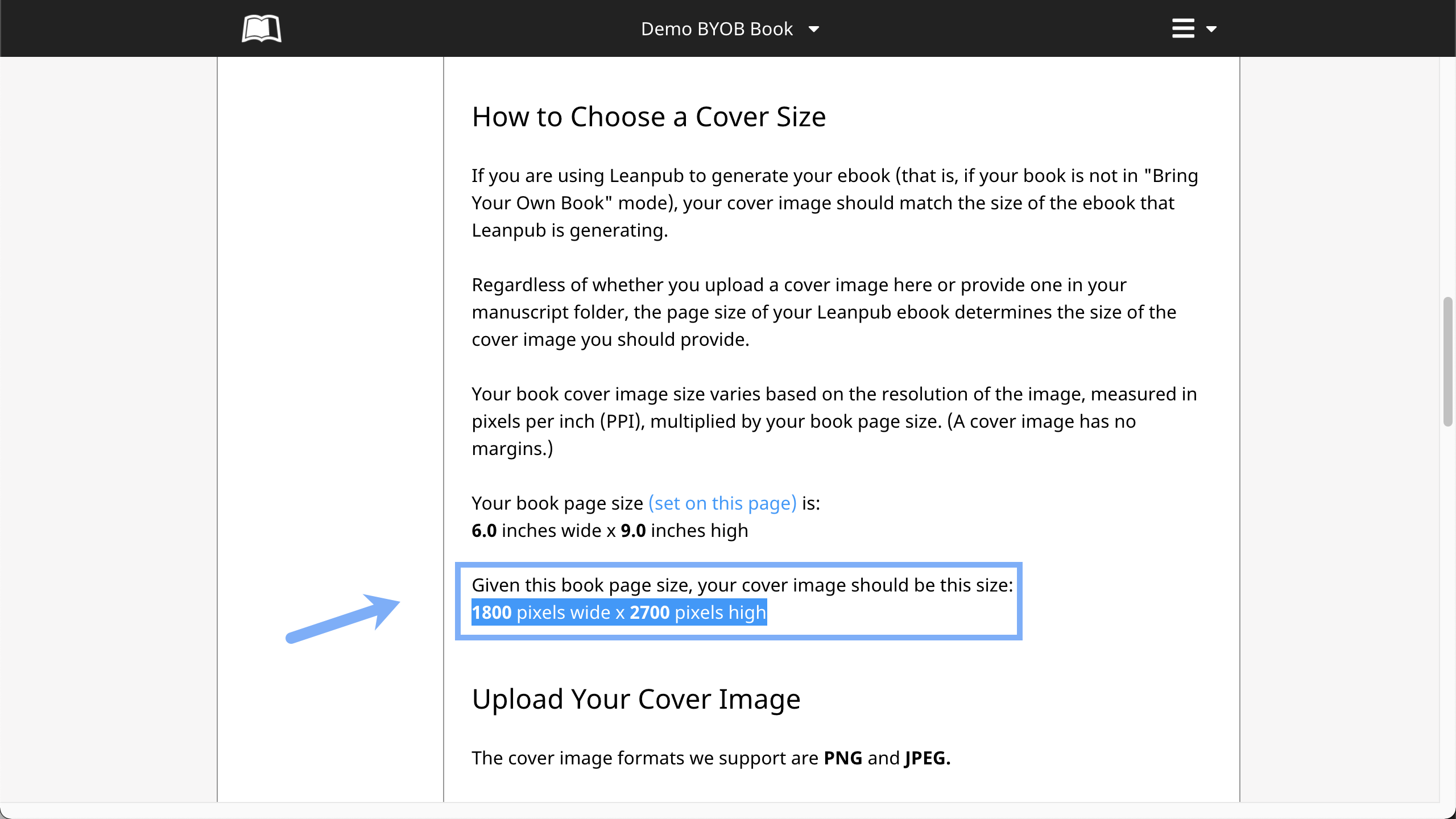 You will see there is a message saying that your book image should be 1800 pixels wide x 2700 pixels high, which is equivalent to, 6.0 inches wide x 9.0 inches high, or, in centimetres, 15.24 cm wide x 22.86 cm high. (This is the same cover size for all books uploaded using the Upload writing mode.)