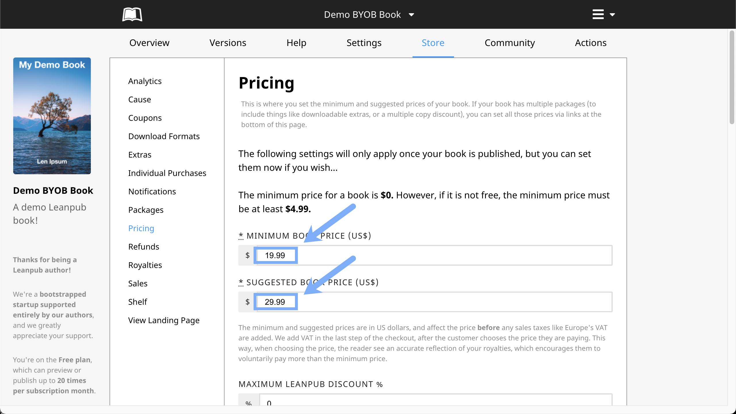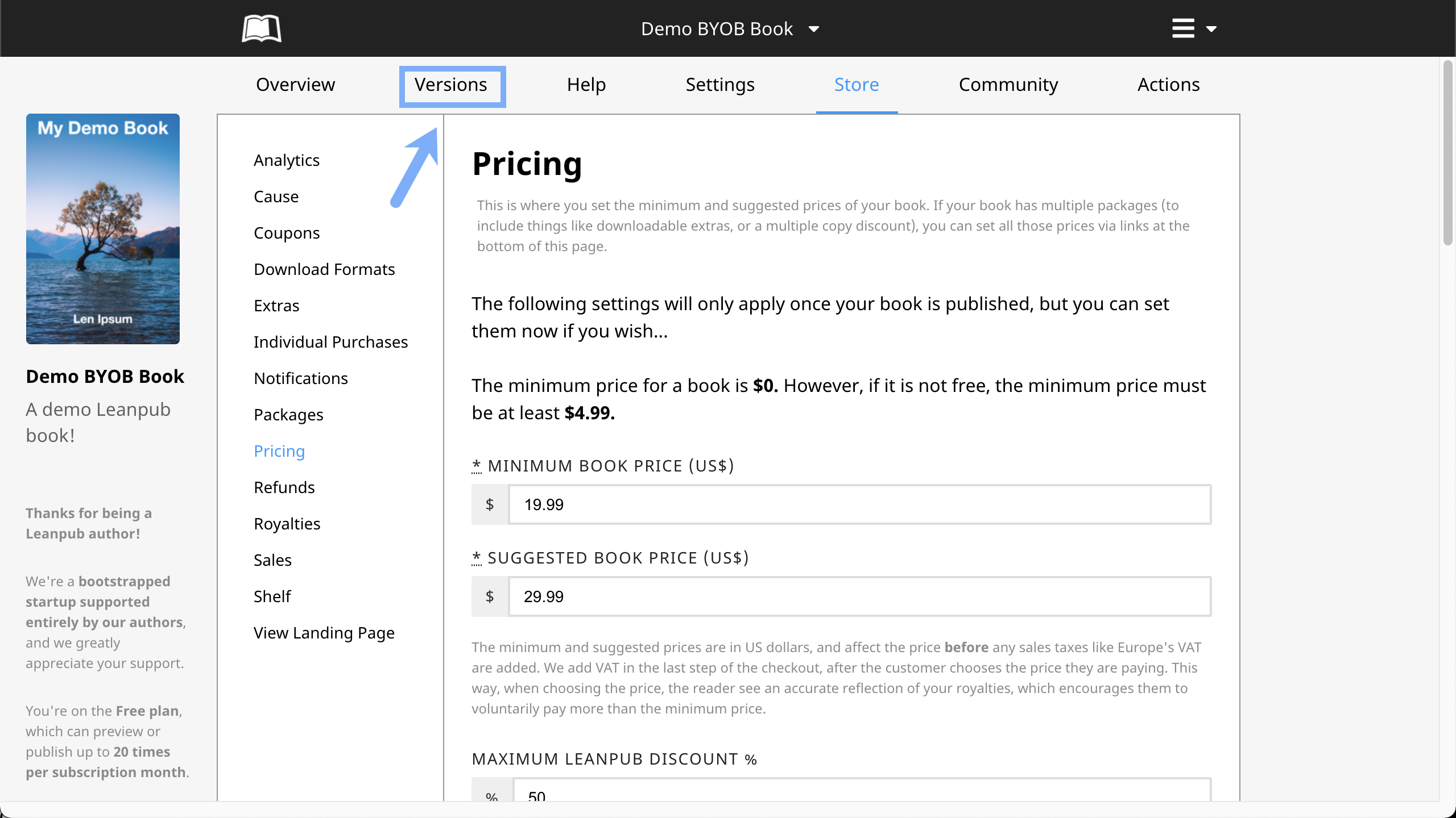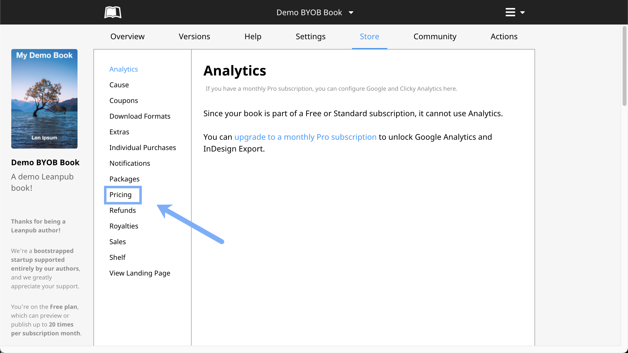 This will take you to the Pricing page for your book: