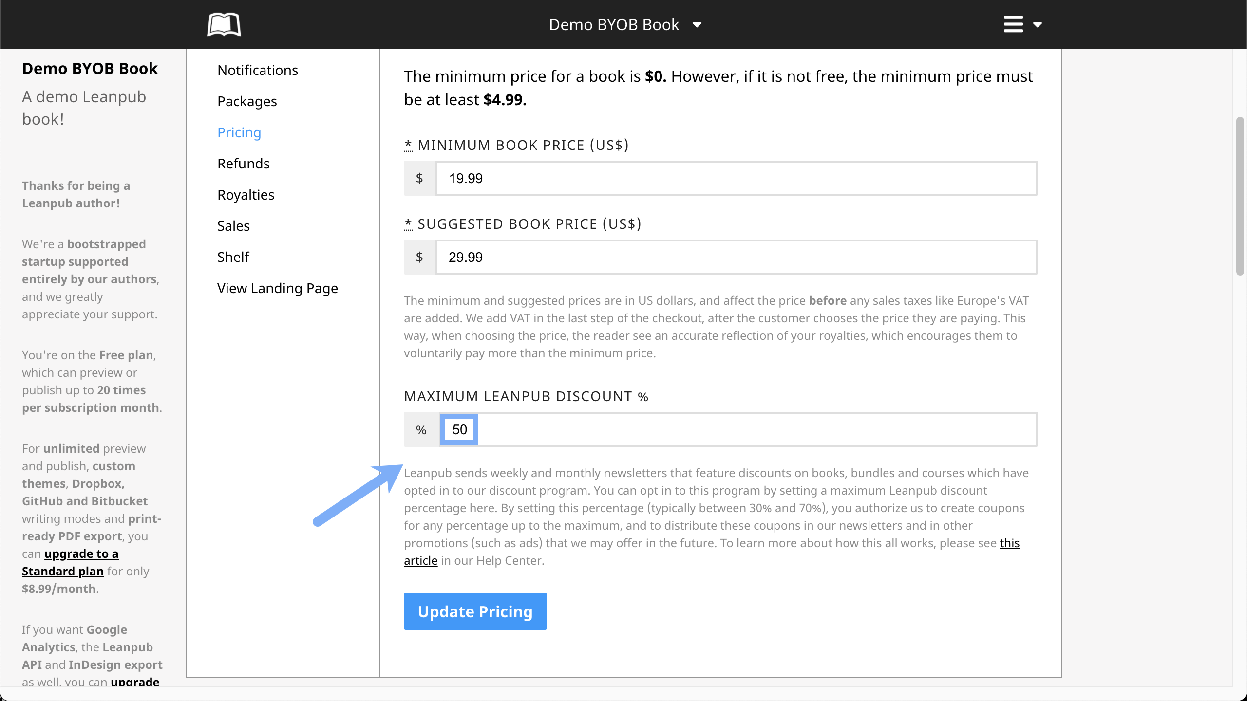 Next, scroll down until you see the "Maximum Leanpub Discount %" section: