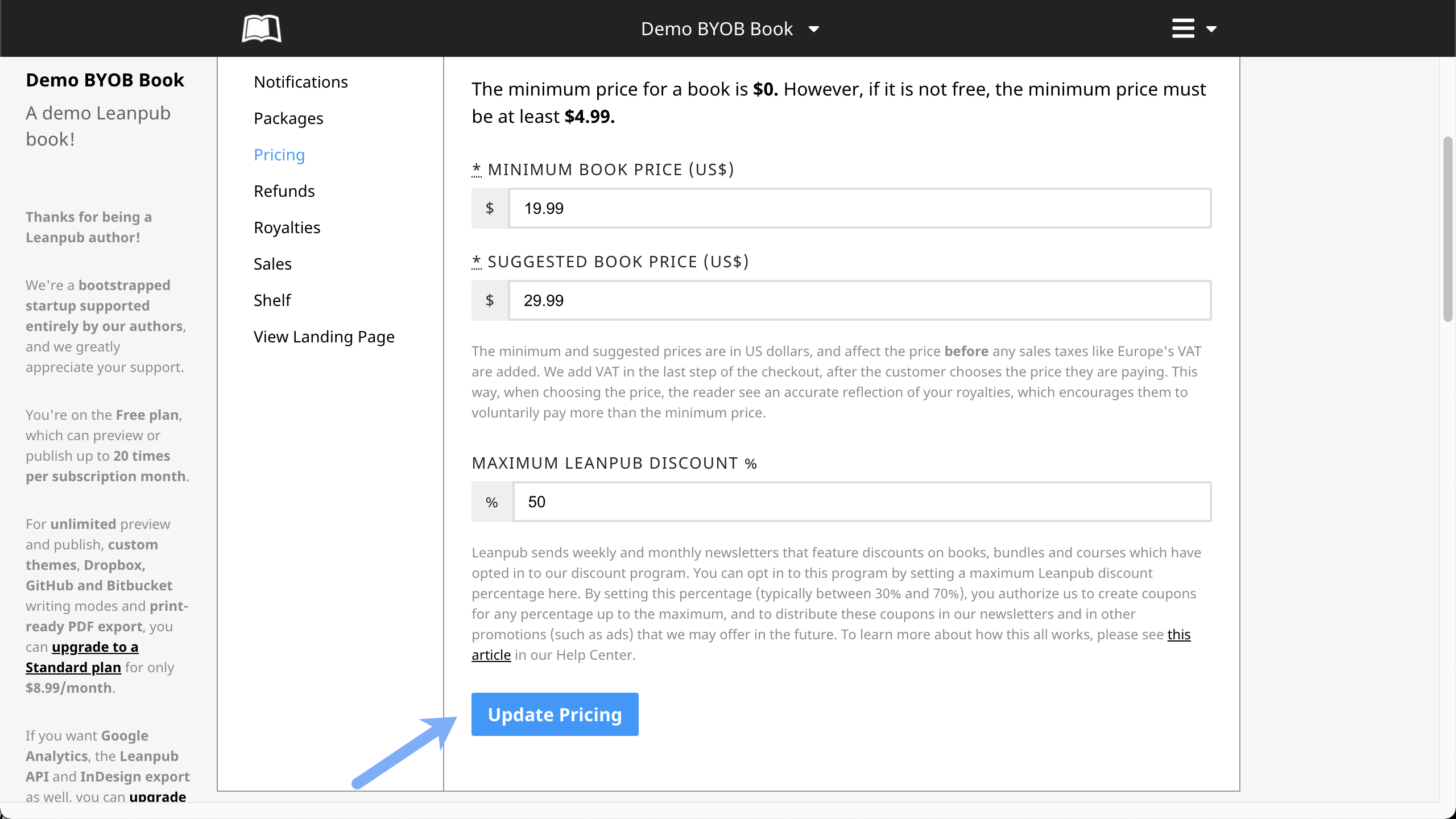 When you've made all your pricing choices here, click the blue "Update Pricing" button: