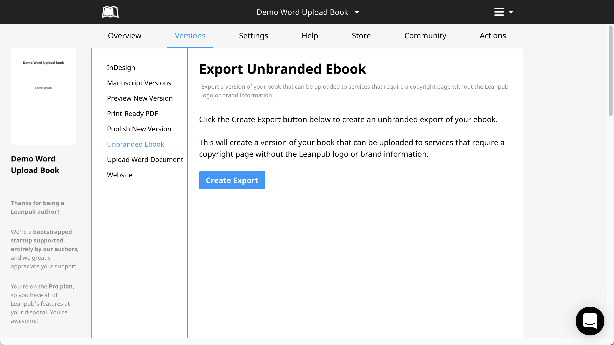 To create a version of your book without the Leanpub-related information on the colophon page, click "Create Export":